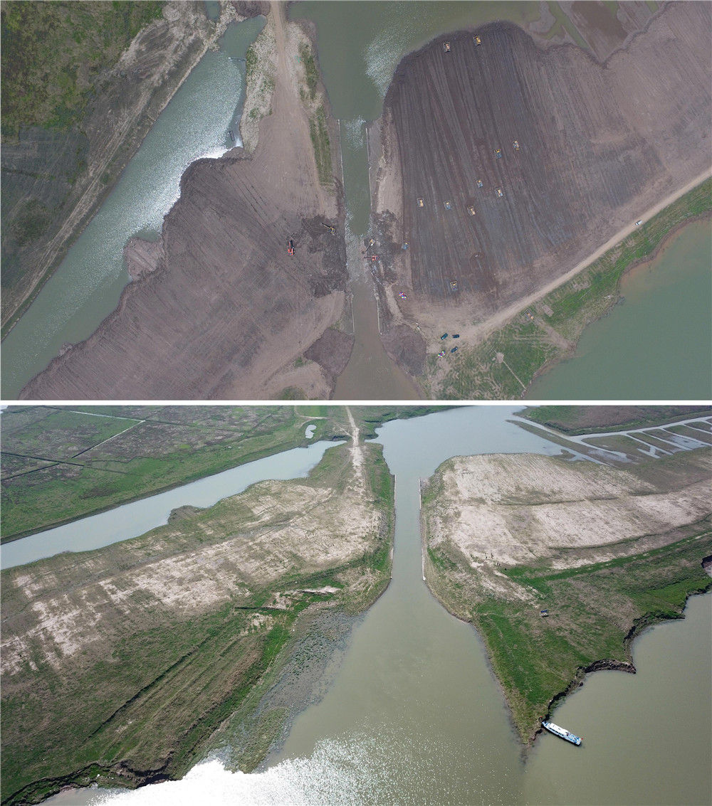 這是一張拼版照片。上圖:2018年6月15日,大型機(jī)械在下塞湖矮圍節(jié)制閘口作業(yè)(新華社記者丁春雨攝,無(wú)人機(jī)照片);下圖:2019年3月12日,下塞湖矮圍節(jié)制閘口經(jīng)過(guò)爆破和清淤疏浚,堤壩已被鏟平,堤外湖與堤內(nèi)水連通(新華社記者陳澤國(guó)攝,無(wú)人機(jī)照片)。新華社發(fā)