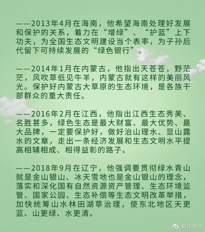 黨的十八大以來,習(xí)近平總書記多次調(diào)研考察時談到生態(tài)環(huán)境保護(hù)問題。山山水水見證了他心系中華民族永續(xù)發(fā)展的情懷。
