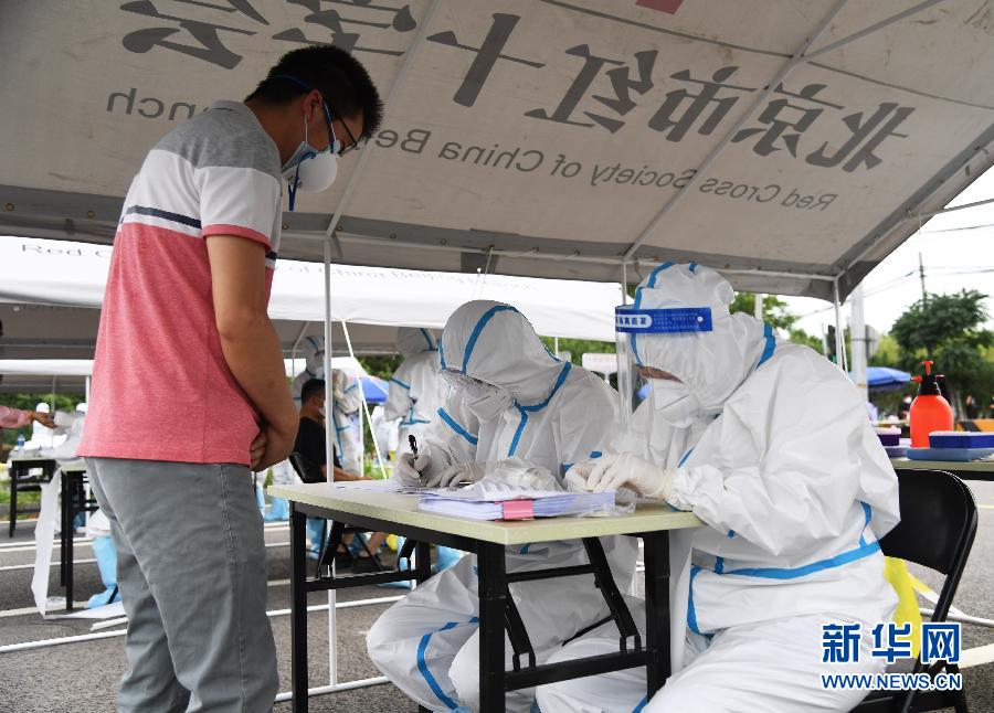 6月15日,在位于北京市豐臺區(qū)新村街道的一處臨時核酸采樣點,工作人員在為進行核酸檢測的人員(左一)登記。 新華社記者 任超 攝