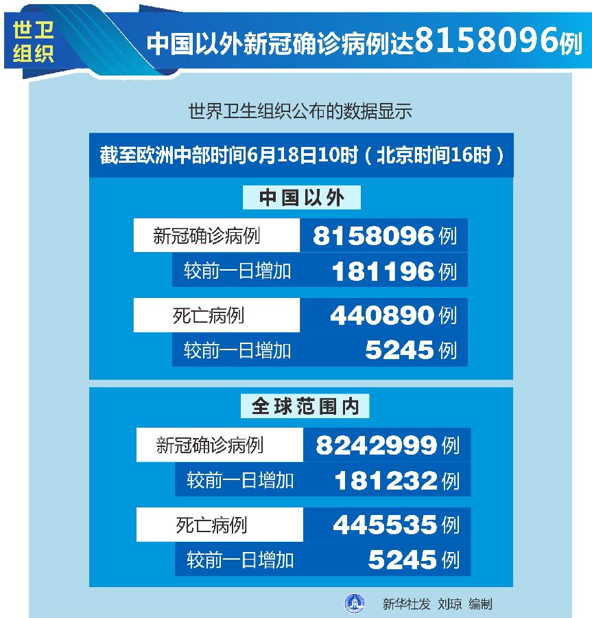 世衛(wèi)組織每日疫情報(bào)告顯示,截至歐洲中部時(shí)間18日10時(shí)(北京時(shí)間16時(shí)),中國以外新冠確診病例較前一日增加181196例,達(dá)到8158096例;中國以外死亡病例較前一日增加5245例,達(dá)到440890例。