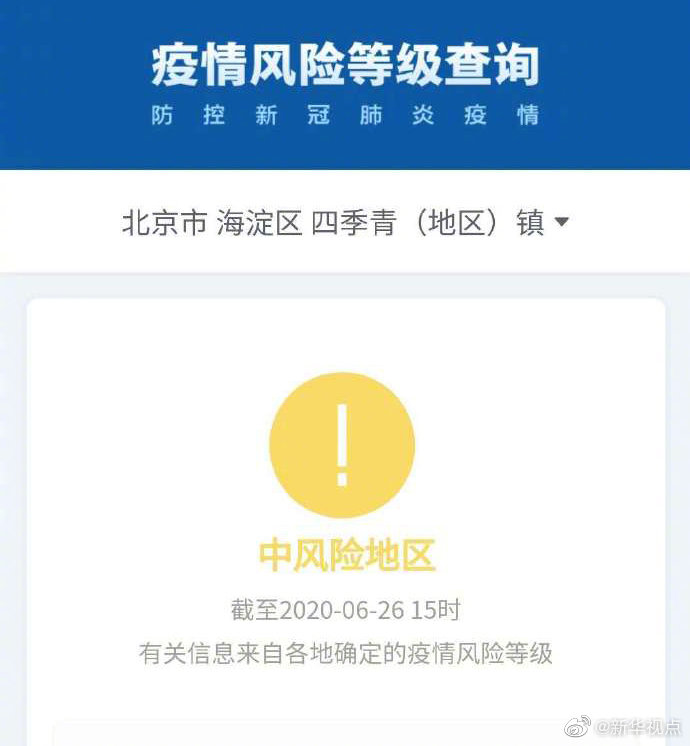 根據(jù)國務(wù)院客戶端小程序“疫情風(fēng)險等級查詢”,截至6月26日15時,北京市西城區(qū)月壇街道由中風(fēng)險地區(qū)變更為低風(fēng)險地區(qū)。海淀區(qū)四季青(地區(qū))鎮(zhèn)、昌平區(qū)回龍觀街道升級為中風(fēng)險地區(qū)。