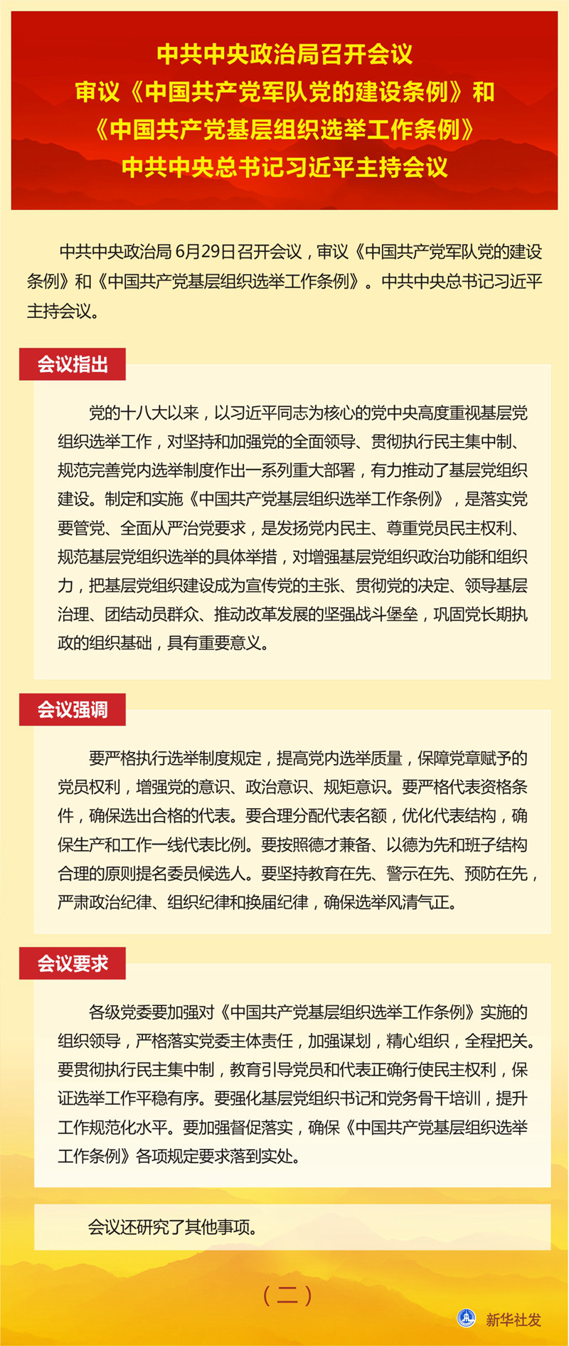 新華社北京6月29日電? 中共中央政治局6月29日召開會(huì)議,審議《中國共產(chǎn)黨軍隊(duì)黨的建設(shè)條例》和《中國共產(chǎn)黨基層組織選舉工作條例》。中共中央總書記習(xí)近平主持會(huì)議。