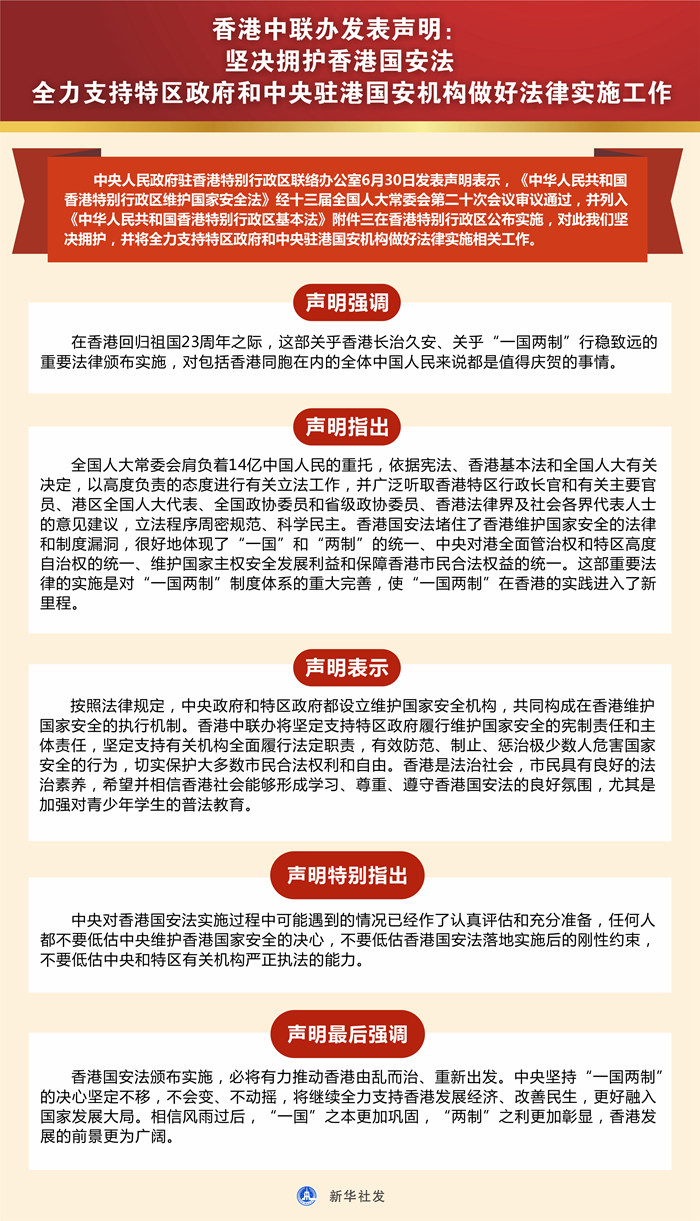 新華社香港6月30日電? 中央人民政府駐香港特別行政區(qū)聯(lián)絡(luò)辦公室30日發(fā)表聲明表示,《中華人民共和國香港特別行政區(qū)維護(hù)國家安全法》經(jīng)十三屆全國人大常委會第二十次會議審議通過,并列入《中華人民共和國香港特別行政區(qū)基本法》附件三在香港特別行政區(qū)公布實(shí)施,對此我們堅決擁護(hù),并將全力支持特區(qū)政府和中央駐港國安機(jī)構(gòu)做好法律實(shí)施相關(guān)工作。