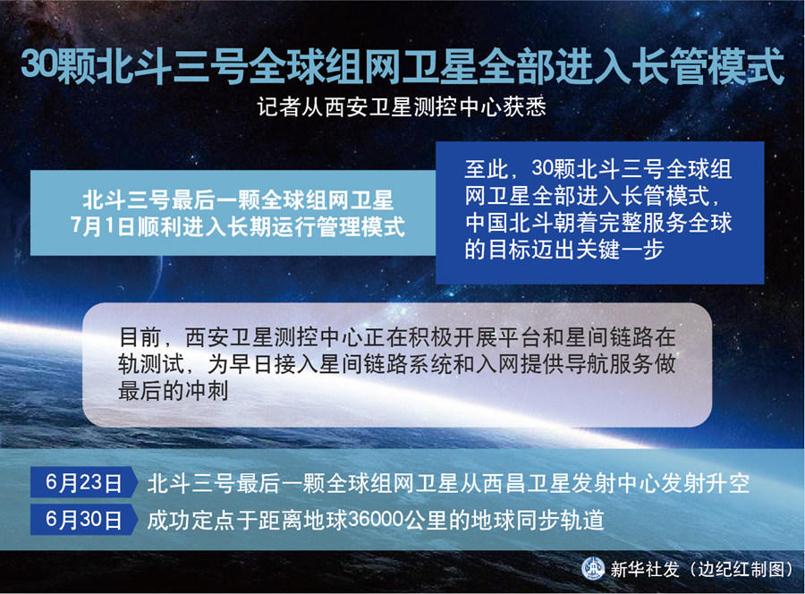 新華社西安7月1日電(李國利、徐新芳)記者從西安衛(wèi)星測控中心獲悉,北斗三號最后一顆全球組網(wǎng)衛(wèi)星1日順利進入長期運行管理模式,至此,30顆北斗三號全球組網(wǎng)衛(wèi)星全部進入長管模式,中國北斗朝著完整服務全球的目標邁出關鍵一步。