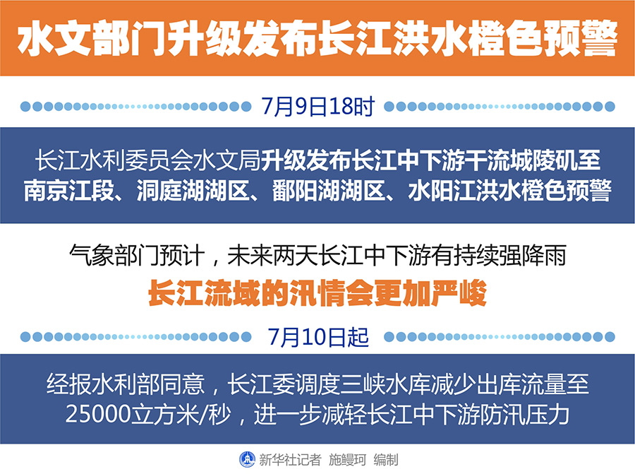 新華社武漢7月9日電(記者李思遠(yuǎn)、樂文婉)長江水利委員會水文局9日18時升級發(fā)布長江中下游干流城陵磯至南京江段、洞庭湖湖區(qū)、鄱陽湖湖區(qū)、水陽江洪水橙色預(yù)警。水文部門提醒,有關(guān)單位和公眾務(wù)必注意防范日益嚴(yán)峻的汛情。