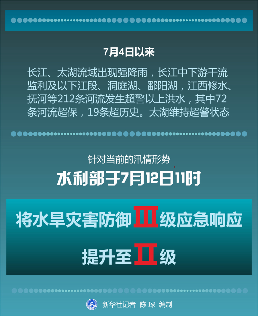 新華社北京7月12日電(記者胡璐)7月4日以來,長江、太湖流域出現(xiàn)強(qiáng)降雨,長江中下游干流監(jiān)利及以下江段、洞庭湖、鄱陽湖,江西修水、撫河等212條河流發(fā)生超警以上洪水,其中72條河流超保,19條超歷史。太湖維持超警狀態(tài)。針對當(dāng)前的汛情形勢,水利部于12日11時(shí)將水旱災(zāi)害防御Ⅲ級(jí)應(yīng)急響應(yīng)提升至Ⅱ級(jí)。