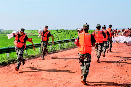 7月13日,江西鄱陽縣珠湖聯(lián)圩出現(xiàn)多處管涌,第72集團軍某旅出動200余名官兵趕赴現(xiàn)場封堵管涌。新華社發(fā)(張毛攝)