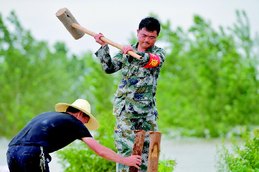 7月12日,江洲鎮(zhèn)柳州村的村支書洪棉雪(右)和村民一起打樁,加固堤壩。新華社記者彭昭之攝