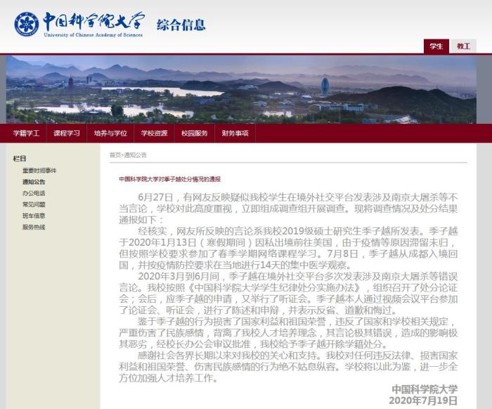 2020年3月到6月間,季子越在境外社交平臺多次發(fā)表涉及南京大屠殺等錯(cuò)誤言論。中國科學(xué)院大學(xué)按照《中國科學(xué)院大學(xué)學(xué)生紀(jì)律處分實(shí)施辦法》,組織召開了處分論證會;會后,應(yīng)季子越的申請,又舉行了聽證會。季子越本人通過視頻會議平臺參加了論證會、聽證會,進(jìn)行了陳述和申辯,并表示反省、道歉和悔過。