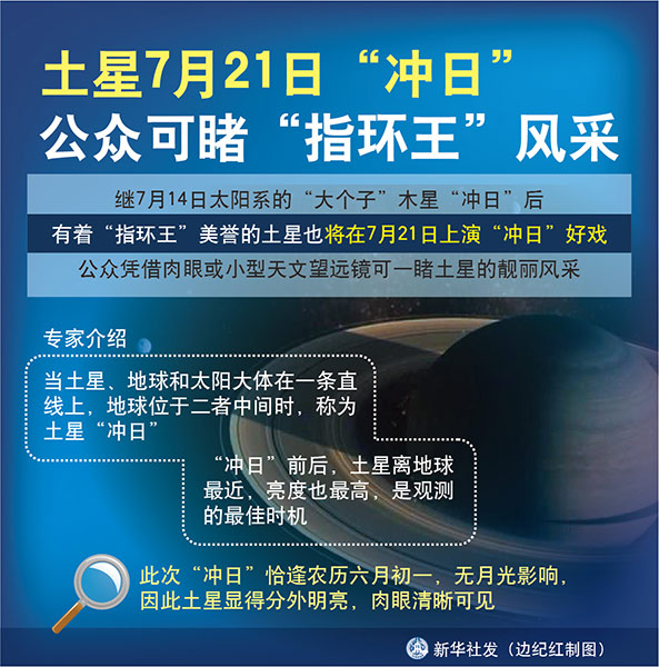 新華社天津7月19日電(記者周潤(rùn)健)繼7月14日太陽(yáng)系的“大個(gè)子”木星“沖日”后,有著“指環(huán)王”美譽(yù)的土星也將在7月21日上演“沖日”好戲,公眾憑借肉眼或小型天文望遠(yuǎn)鏡可一睹土星的靚麗風(fēng)采。