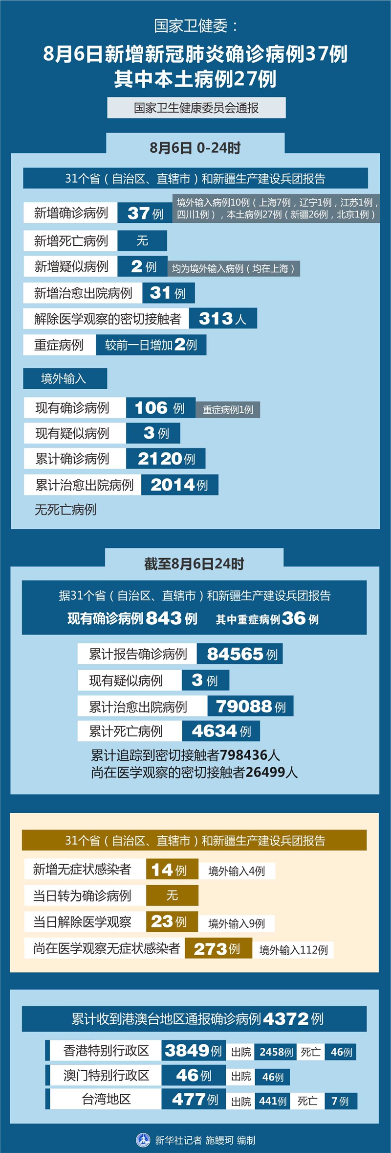 截至8月6日24時,據(jù)31個?。ㄗ灾螀^(qū)、直轄市)和新疆生產(chǎn)建設(shè)兵團(tuán)報告,現(xiàn)有確診病例843例(其中重癥病例36例),累計治愈出院病例79088例,累計死亡病例4634例,累計報告確診病例84565例,現(xiàn)有疑似病例3例。累計追蹤到密切接觸者798436人,尚在醫(yī)學(xué)觀察的密切接觸者26499人。