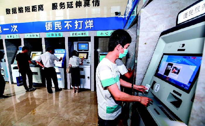 5月28日,市民在浙江省湖州市吳興區(qū)24小時(shí)自助服務(wù)大廳通過(guò)綜合自助機(jī)辦理相關(guān)業(yè)務(wù) 徐昱攝/本刊