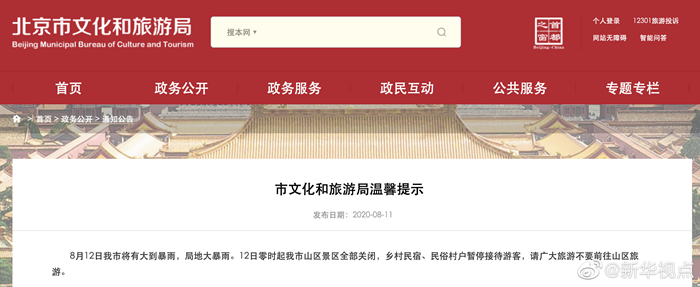 北京市文旅局11日晚間發(fā)布提示稱,8月12日北京將有大到暴雨,局地大暴雨,12日零時(shí)起本市山區(qū)景區(qū)全部關(guān)閉,鄉(xiāng)村民宿、民俗村戶暫停接待游客,廣大游客不要前往山區(qū)旅游。(記者張漫子) ?????