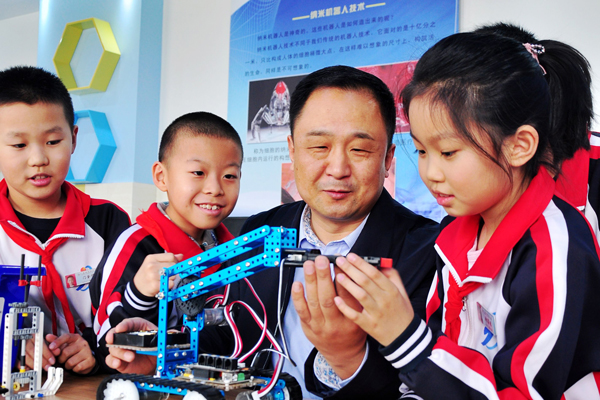 楊國(guó)營(yíng)與學(xué)生在機(jī)器人課上