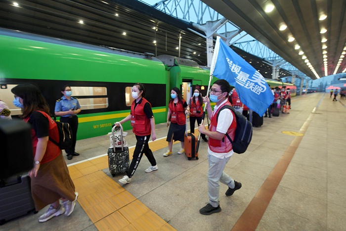 8月16日,參加2020年“發(fā)現(xiàn)最美鐵路”網(wǎng)宣活動的媒體記者乘坐列車出發(fā)。(中國國家鐵路集團(tuán)有限公司供圖 楊寶森攝)
