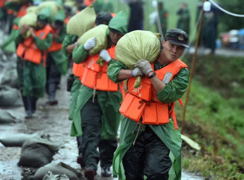 和平年代,面對(duì)波濤洶涌的洪水,解放軍官兵、民兵、消防救援人員緊急搶險(xiǎn)救災(zāi)。老百姓則紛紛走出家門,給搶險(xiǎn)救災(zāi)人員送去食物,送去溫暖: