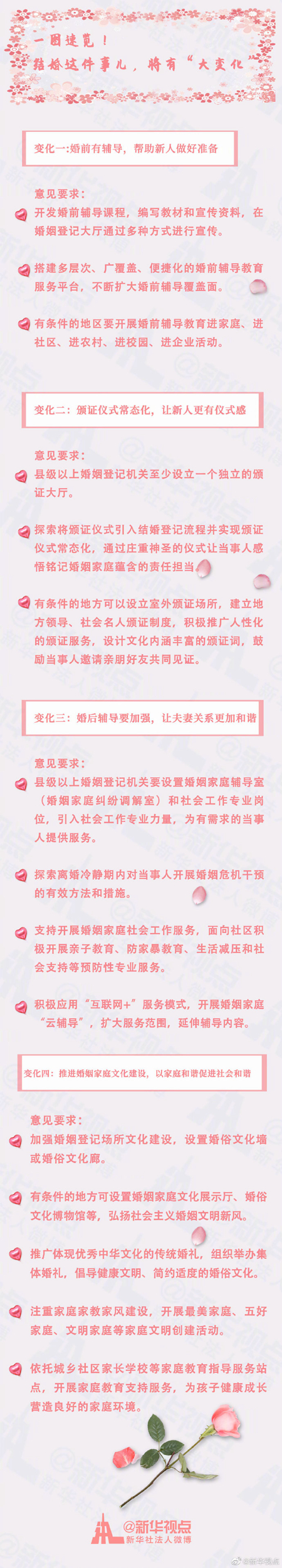 婚姻是家庭的紐帶,婚姻家庭和諧事關(guān)民生幸福和社會穩(wěn)定。意見要求,要探索開展婚前輔導(dǎo),開發(fā)婚前輔導(dǎo)課程,編寫教材和宣傳資料,在婚姻登記大廳通過宣傳欄、視頻、免費贈閱等方式進(jìn)行宣傳,幫助當(dāng)事人做好進(jìn)入婚姻狀態(tài)的準(zhǔn)備,學(xué)會管理婚姻,努力從源頭上減少婚姻家庭糾紛的產(chǎn)生。
