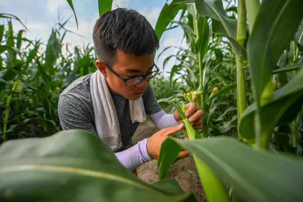 在吉林省梨樹縣四棵樹鄉(xiāng)三棵樹村的“科技小院”試驗(yàn)田,中國農(nóng)業(yè)大學(xué)在讀碩士沙野查看玉米長勢(shì)(2019年7月24日攝)。新華社記者 張楠 攝?