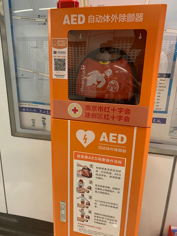 按照國際急救專家的共識,應(yīng)該每5公里配備一臺AED,也就是說在4分鐘以內(nèi)可以成功取到AED,并到達事發(fā)現(xiàn)場。在江蘇南京,所有的地鐵站點都已經(jīng)安裝了AED,南京率先在長三角地區(qū)實現(xiàn)了全覆蓋。