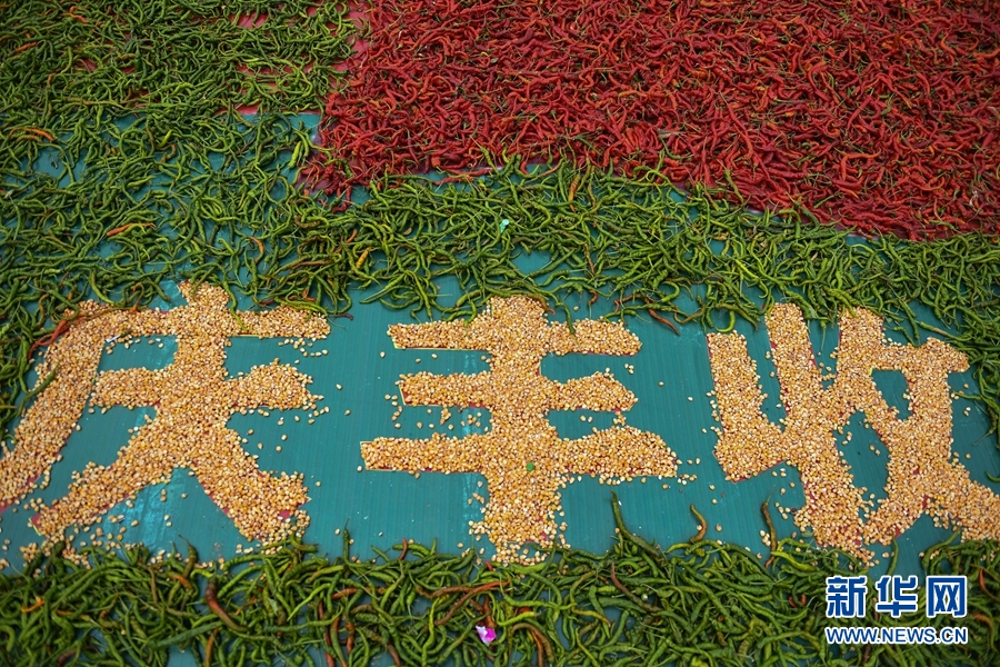 2020年慶祝中國農(nóng)民豐收節(jié)暨循化縣消費(fèi)扶貧“辣椒節(jié)”上由線辣椒和玉米拼成的慶豐收?qǐng)D案。(新華網(wǎng)潘彬彬攝)