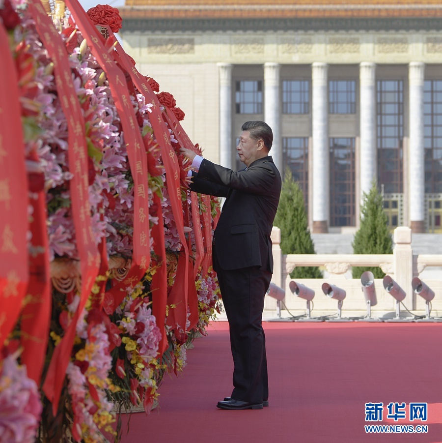 9月30日上午,黨和國家領(lǐng)導(dǎo)人習(xí)近平、李克強、栗戰(zhàn)書、汪洋、王滬寧、趙樂際、韓正、王岐山等來到北京天安門廣場,出席烈士紀念日向人民英雄敬獻花籃儀式。這是習(xí)近平整理花籃上的緞帶。 新華社記者 申宏 攝
