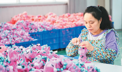 近年來(lái),陜西省安康市漢濱區(qū)緊抓蘇陜扶貧協(xié)作機(jī)遇,積極利用協(xié)作項(xiàng)目推動(dòng)當(dāng)?shù)亟?jīng)濟(jì)和社會(huì)事業(yè)發(fā)展。圖為工人在漢濱區(qū)五里工業(yè)集中區(qū)一家毛絨玩具公司的車(chē)間內(nèi)工作,該工業(yè)集中區(qū)由蘇陜協(xié)作資金幫助建設(shè)。新華社記者 邵 瑞攝