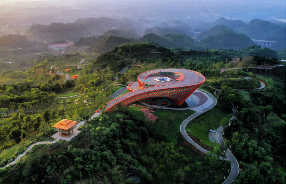 成都天府新區(qū)規(guī)劃館可以俯瞰興隆湖的部分“湖景”。從空中看,這個狀如開關按鈕的建筑物放置在湖畔的小山頭上。