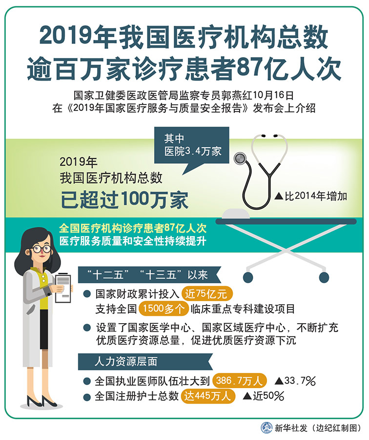 新華社北京10月16日電(記者呂諾、王琳琳)國家衛(wèi)健委醫(yī)政醫(yī)管局監(jiān)察專員郭燕紅16日在《2019年國家醫(yī)療服務(wù)與質(zhì)量安全報告》發(fā)布會上介紹,2019年,我國醫(yī)療機構(gòu)總數(shù)已超過100萬家,其中醫(yī)院3.4萬家。全國醫(yī)療機構(gòu)診療患者87億人次,醫(yī)療服務(wù)質(zhì)量和安全性持續(xù)提升。