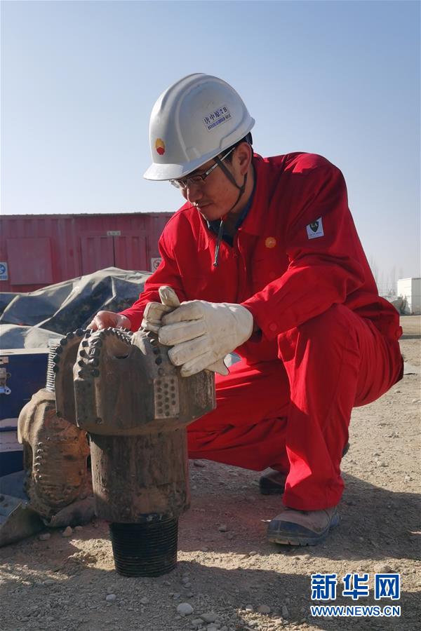 11月10日,中國石油塔里木油田勘探事業(yè)部臺盆區(qū)勘探項目部鉆井工程技術(shù)員唐中原在檢查鉆機(jī)的鉆頭。新華社發(fā)(中國石油塔里木油田供圖)