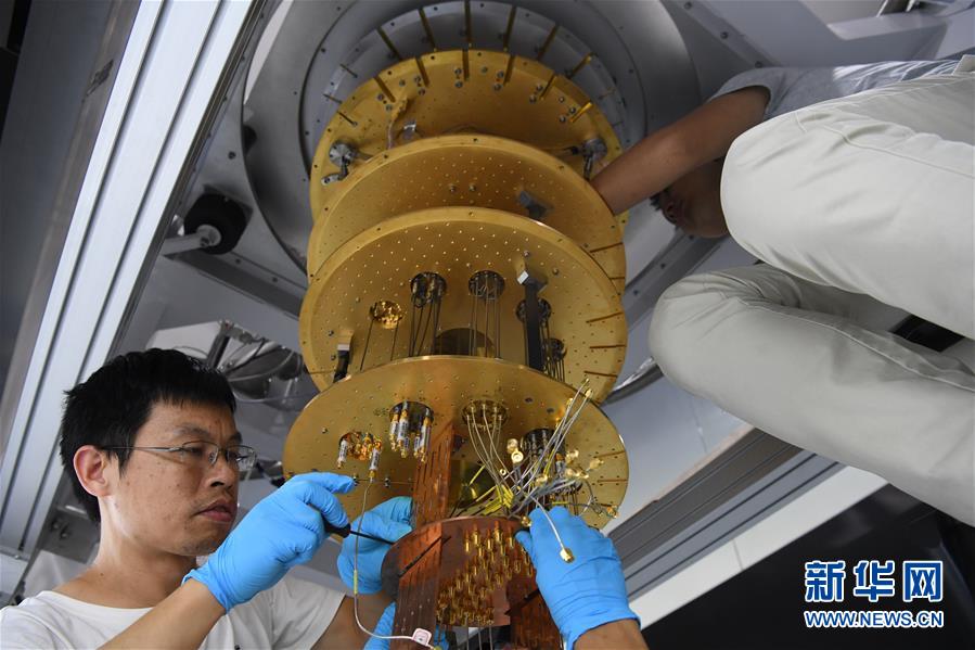 在安徽合肥的本源量子實驗室,科研團(tuán)隊工作人員在裝置量子計算制冷系統(tǒng)(2020年9月攝)。? 新華社發(fā)