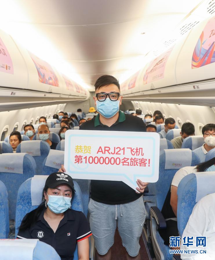 7月20日晚,ARJ21飛機(jī)的第100萬(wàn)名乘客在機(jī)艙內(nèi)拍照留念。該架飛機(jī)從上饒三清山機(jī)場(chǎng)起飛,在成都雙流機(jī)場(chǎng)降落。新華社記者 丁汀 攝
