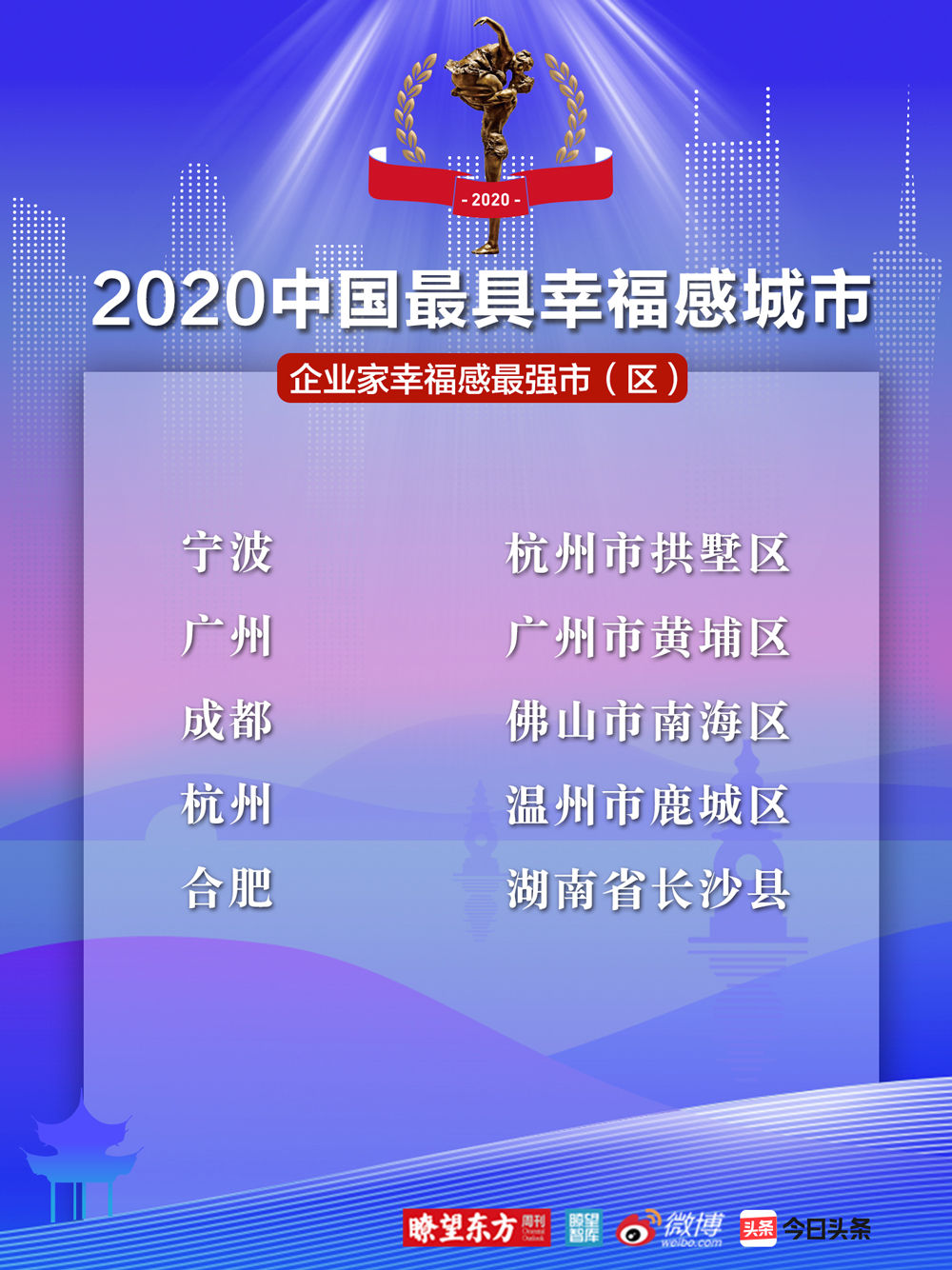 根據(jù)主觀調(diào)查問卷對企業(yè)主(家)幸福感的調(diào)查結(jié)果,組委會評選寧波、廣州、成都、杭州、合肥、杭州市拱墅區(qū)、廣州市黃埔區(qū)、佛山市南海區(qū)、溫州市鹿城區(qū)、湖南省長沙縣為“企業(yè)家幸福感最強(qiáng)市(區(qū))”。