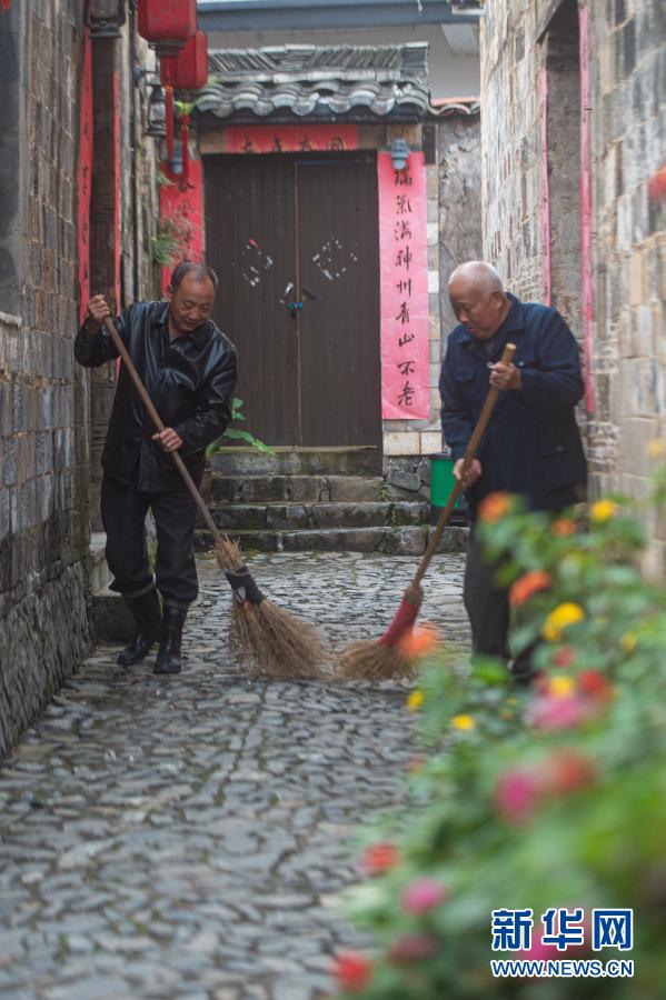 11月17日,大陳村村民汪須倉(cāng)(左)、汪巖宣義務(wù)打掃村內(nèi)的石板路。從2005年起,大陳村號(hào)召村民“美村必先潔家”,義務(wù)打掃也逐漸成為大家的一種習(xí)慣。新華社發(fā)(江漢 攝)