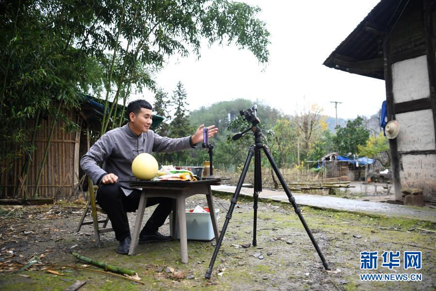 梁平七星鎮(zhèn)小伙曾慶貴通過網(wǎng)絡(luò)直播推銷家鄉(xiāng)特色農(nóng)產(chǎn)品(11月18日攝)。新華社記者 唐奕 攝