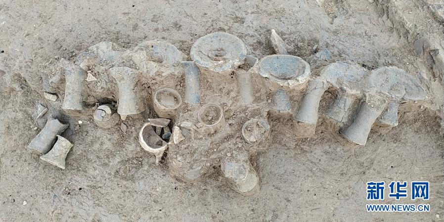 圖為河南葉縣余莊遺址標號為T0405的探方出土的陶器,該組陶器擺放有序,呈現(xiàn)出鮮明的禮制色彩(11月3日攝)。新華社發(fā)(河南省文物考古研究院供圖)