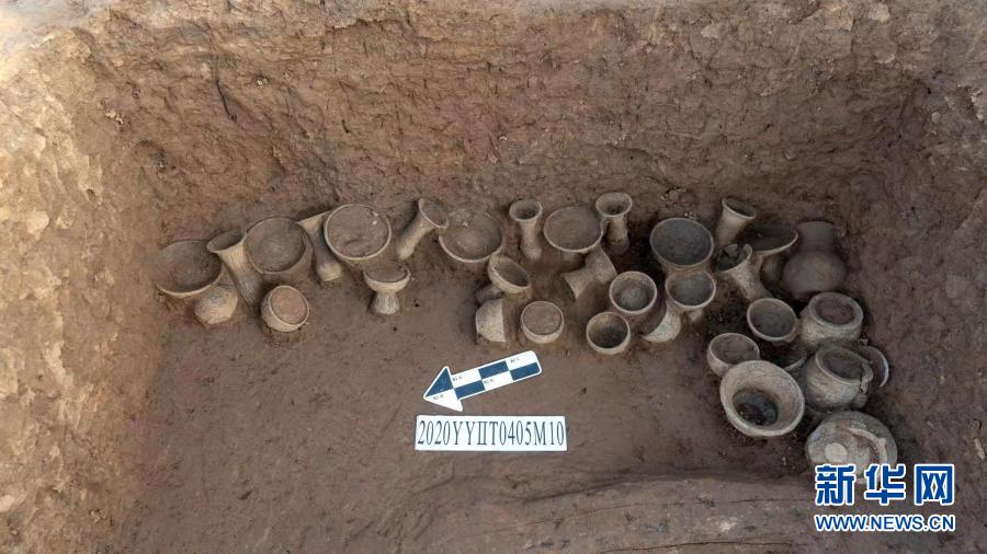圖為河南葉縣余莊遺址標號為M10的墓葬出土的隨葬陶器。該組陶器擺放有序、器類成組,呈現(xiàn)出鮮明的禮制色彩(11月3日攝)。新華社發(fā)(河南省文物考古研究院供圖)