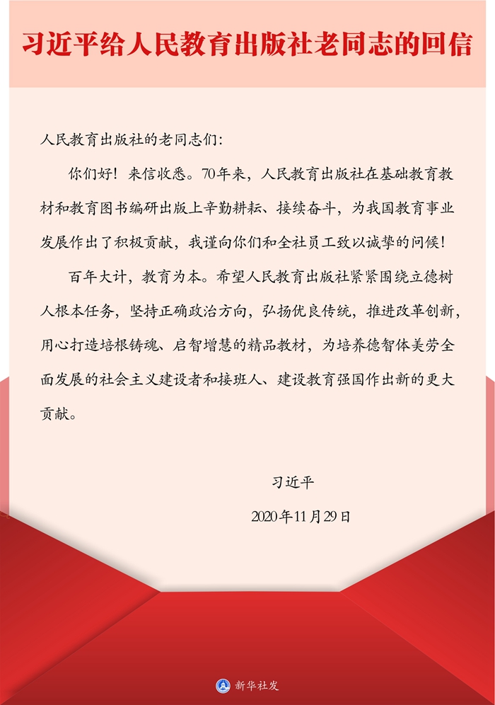 你們好!來信收悉。70年來,人民教育出版社在基礎教育教材和教育圖書編研出版上辛勤耕耘、接續(xù)奮斗,為我國教育事業(yè)發(fā)展作出了積極貢獻,我謹向你們和全社員工致以誠摯的問候!
