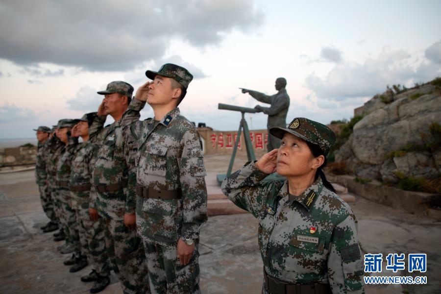 在江蘇省灌云縣開山島,王仕花(右一)和輪值民兵一起向國旗敬禮(9月27日攝)。新華社記者 劉芳 攝