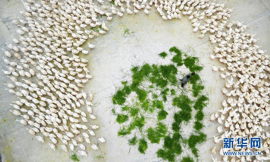 工作人員在貴州省黔東南苗族侗族自治州錦屏縣馬臺商品鵝養(yǎng)殖基地養(yǎng)鵝(12月8日攝)。新華社記者 劉續(xù) 攝