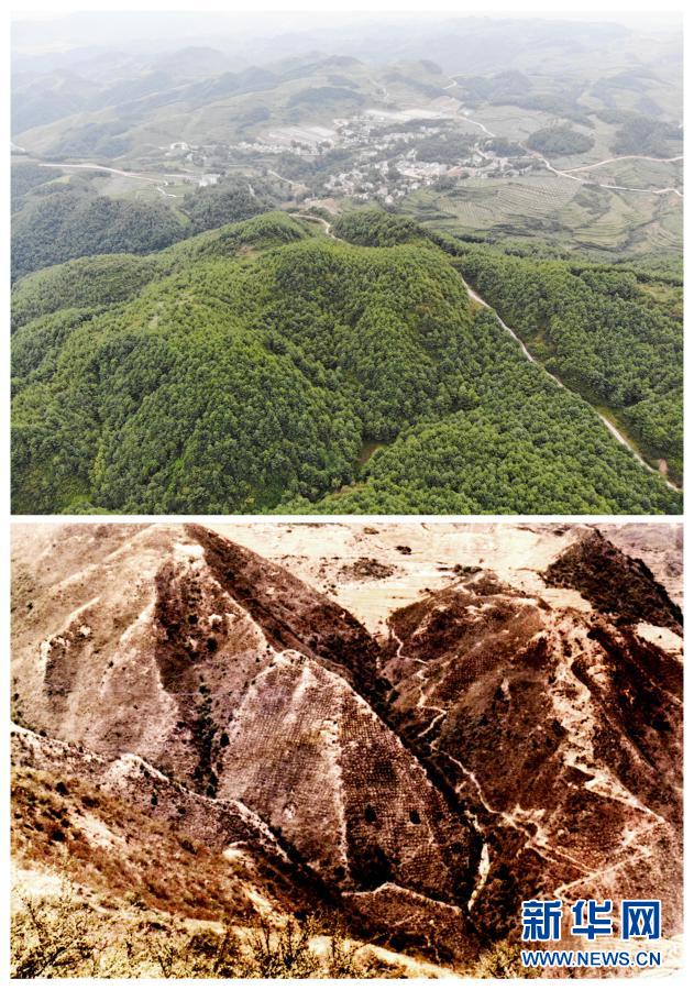 拼版照片:上圖為2019年7月25日拍攝的貴州省赫章縣河鎮(zhèn)鄉(xiāng)海雀村披綠的山坡(無人機(jī)照片,新華社記者楊文斌攝);下圖為上世紀(jì)80年代海雀村石漠化嚴(yán)重的山坡(資料照片)。新華社發(fā)