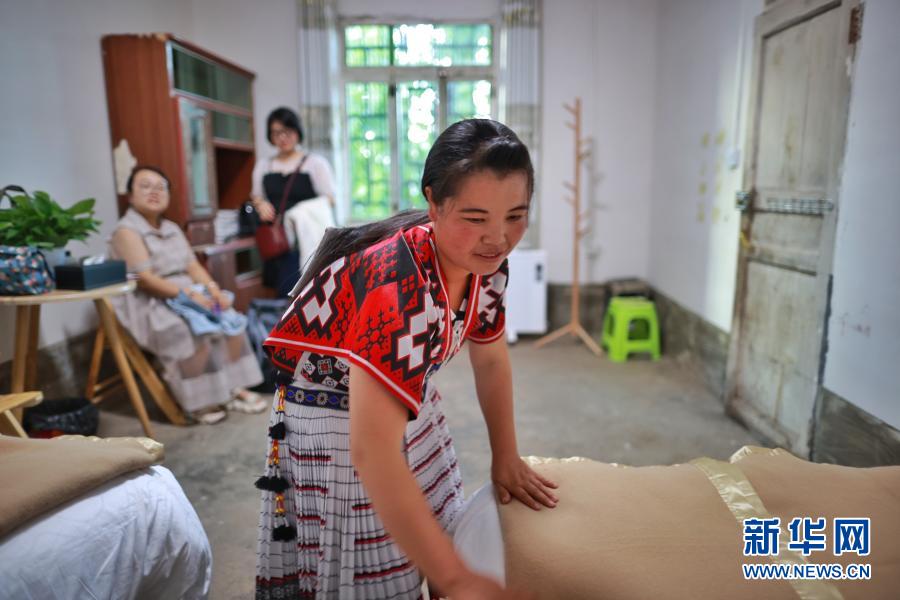 貴州省赫章縣河鎮(zhèn)鄉(xiāng)海雀村一家民宿的人員在整理房間(8月4日攝)。新華社記者 劉續(xù) 攝