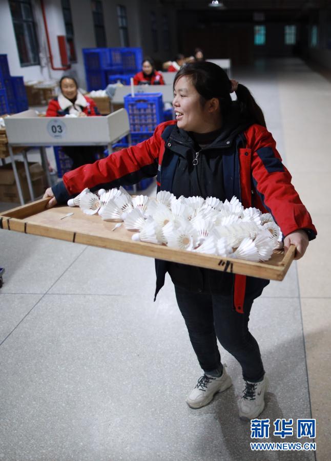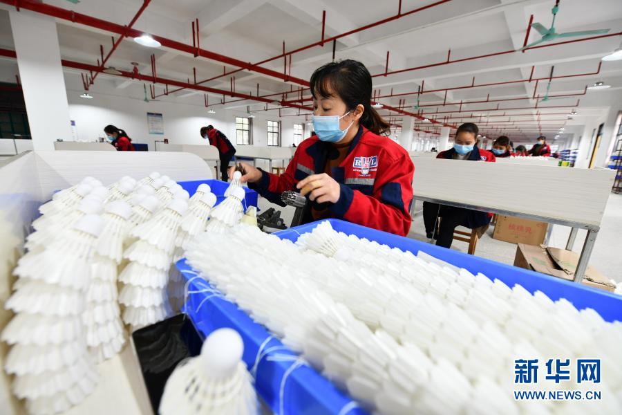 工人在位于貴州省錦屏縣敦寨鎮(zhèn)的貴州亞獅龍?bào)w育文化產(chǎn)業(yè)發(fā)展有限公司羽毛球加工廠工作(3月12日攝)。新華社記者 楊文斌 攝