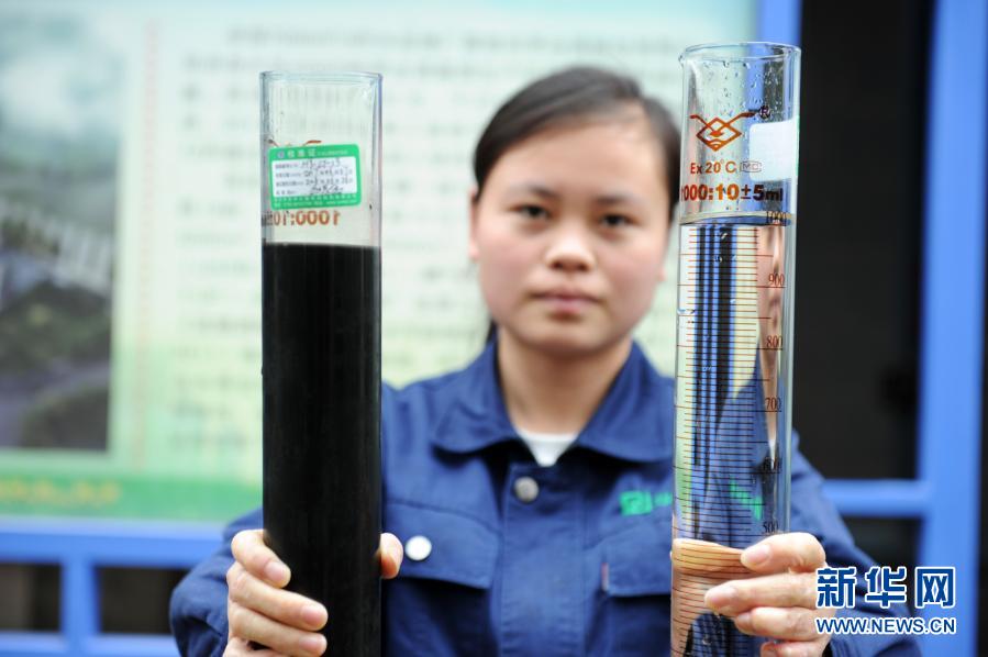 貴州省仁懷市茅臺酒廠污水處理廠的工人展示污水處理前后的水質(zhì)對比效果(2018年10月23日攝)。新華社記者 楊文斌 攝
