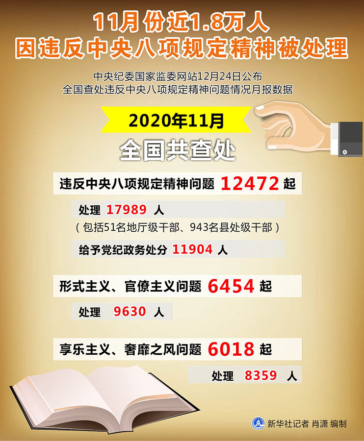 新華社北京12月24日電(記者孫少龍)中央紀委國家監(jiān)委網(wǎng)站24日公布全國查處違反中央八項規(guī)定精神問題情況月報數(shù)據(jù)。通報顯示,2020年11月,全國共查處違反中央八項規(guī)定精神問題12472起,處理17989人(包括51名地廳級干部、943名縣處級干部),給予黨紀政務(wù)處分11904人。