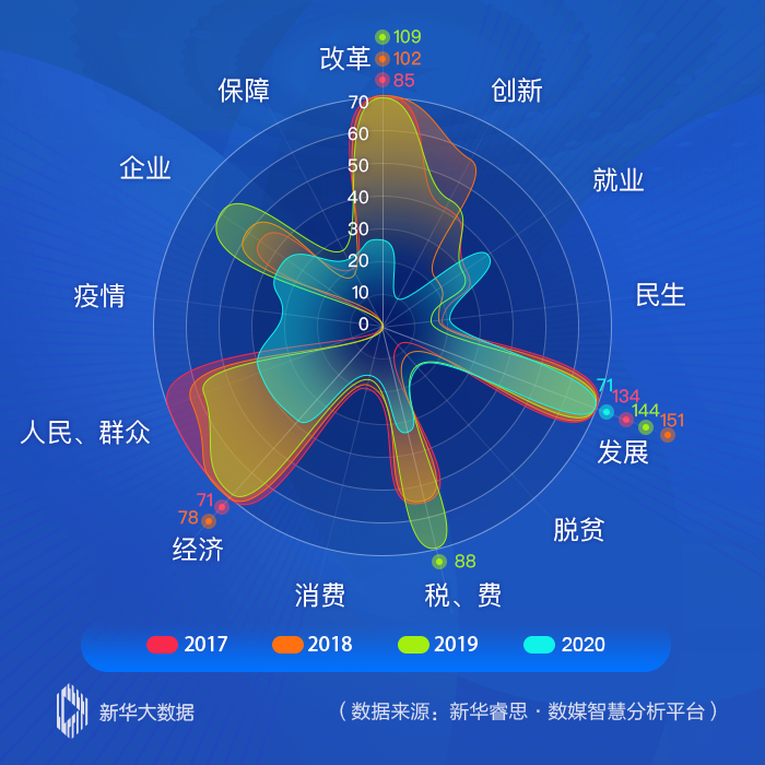 政府工作報(bào)告出爐,字斟句酌有多用心?新華睿思對2017年至2020年四年的政府工作報(bào)告進(jìn)行了文本語義分析。四年來,政府工作報(bào)告圍繞“發(fā)展”“改革”“經(jīng)濟(jì)”進(jìn)行了全面的闡述和工作部署,回應(yīng)群眾關(guān)切,堅(jiān)持把人民群眾的利益放在第一位。