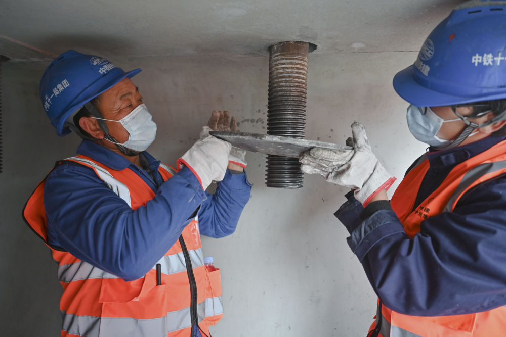 1月28日,杜學(xué)剛(右)和工友爬進箱梁,準(zhǔn)備拆卸提梁固定螺栓。