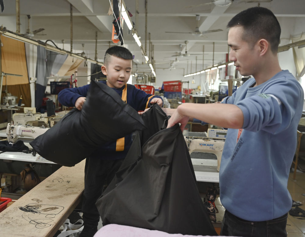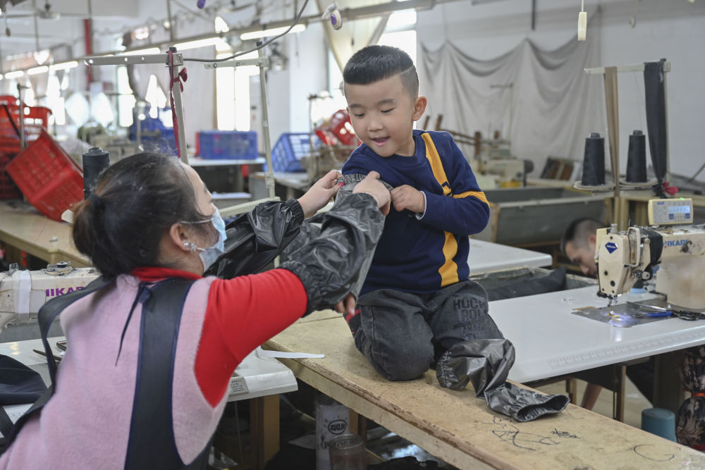 1月26日,在福建省石獅市的金利萊斯服裝廠,聰聰和黃海龍在一起。