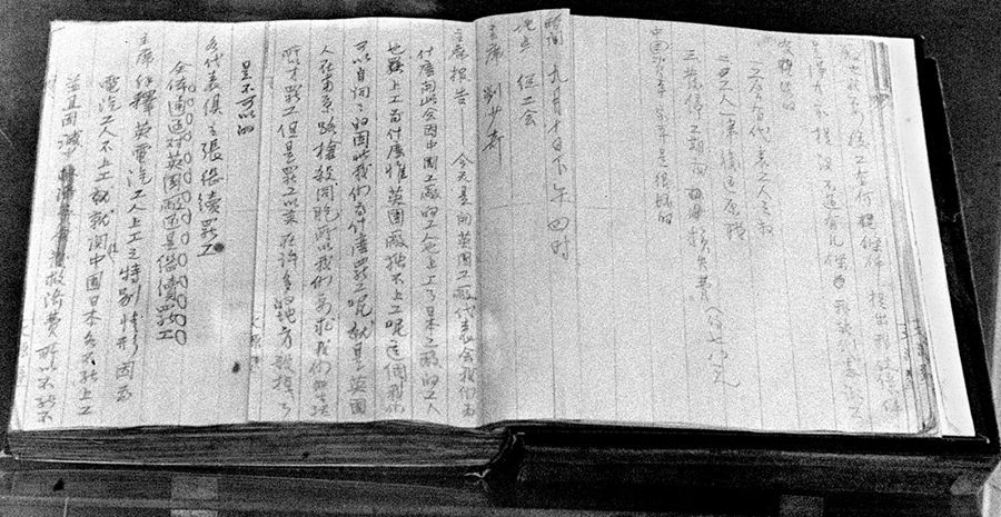 圖為五卅運(yùn)動(dòng)期間劉少奇同志召集上海英國(guó)工廠工人代表開(kāi)會(huì)的一份會(huì)議記錄,會(huì)議一致通過(guò)對(duì)英國(guó)工廠繼續(xù)罷工 新華社圖片