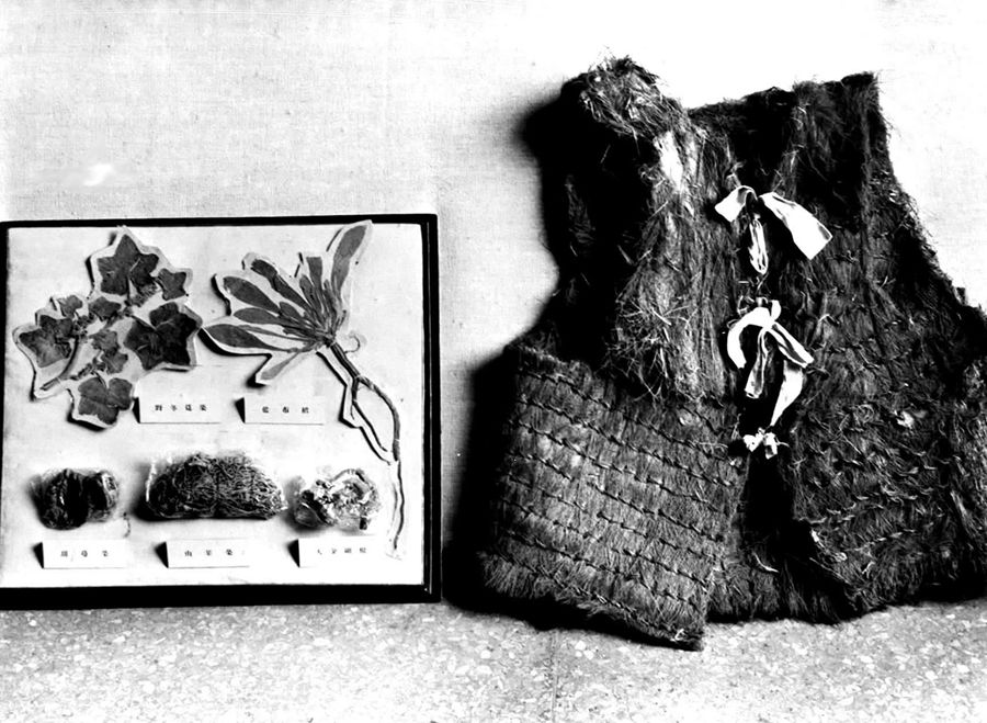 紅軍長征時吃過的野菜的標本(左)和穿過的棕背心 新華社圖片