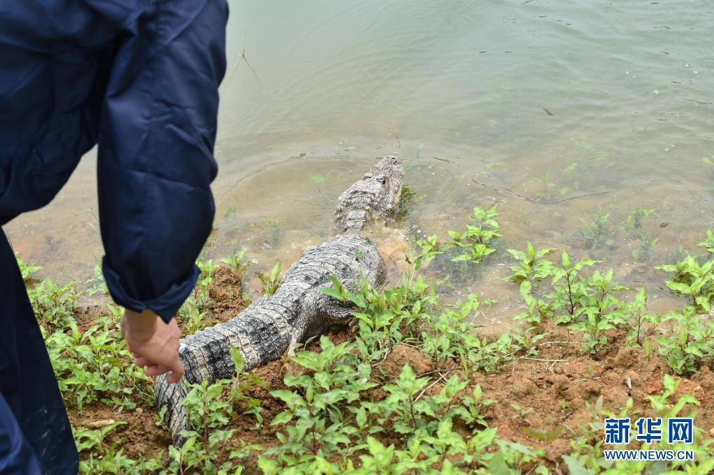 5月13日,工作人員放歸揚子鱷。當(dāng)日,安徽揚子鱷國家級自然保護(hù)區(qū)在涇縣雙坑片區(qū)揚子鱷核心棲息地放歸51條人工繁育揚子鱷?!⌒氯A社記者 韓旭 攝
